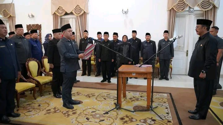 SUKABUMI — Bupati Sukabumi H. Asep Japar mengukuhkan dan mengambil sumpah janji/jabatan manajerial di lingkungan Pemerintah Kabupaten Sukabumi, bertempat di Pendopo Sukabumi, Kamis (8/1/2026). Pengukuhan tersebut dilaksanakan seiring adanya perubahan nomenklatur Struktur Organisasi dan Tata Kerja (SOTK) pada sejumlah perangkat daerah.