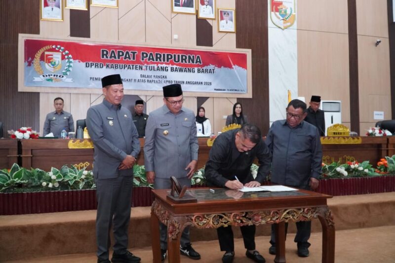 TUBABA – Proses pembahasan Rancangan Peraturan Daerah (Raperda) Anggaran Pendapatan dan Belanja Daerah (APBD) Kabupaten Tulang Bawang Barat Tahun Anggaran 2026 telah rampung. Bupati Tulang Bawang Barat, Ir. Novriwan Jaya, S.P., menghadiri Rapat Paripurna Pembicaraan Tingkat II yang menandai persetujuan Raperda tersebut di Ruang Paripurna DPRD setempat, Jumat (28/11/2025).