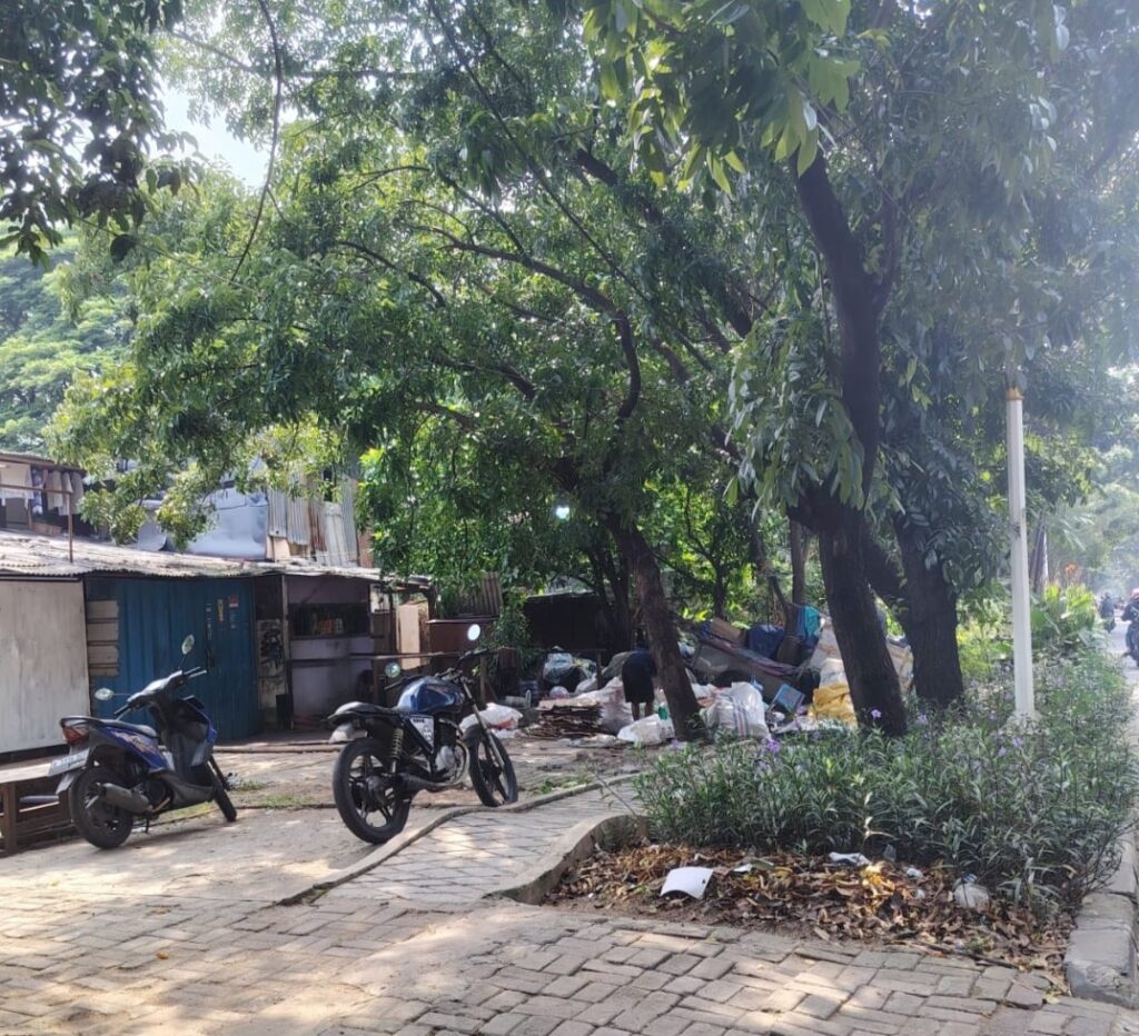 Pantauan di lokasi menunjukkan kondisi jalur hijau yang kumuh dan tak terawat. Bangunan semi permanen berdiri berderet, menutup fungsi taman, bahkan sebagian dijadikan tempat penampungan barang bekas. Situasi ini diperparah dengan terbengkalainya rumah adat Betawi yang dahulu menjadi ikon kawasan tersebut.