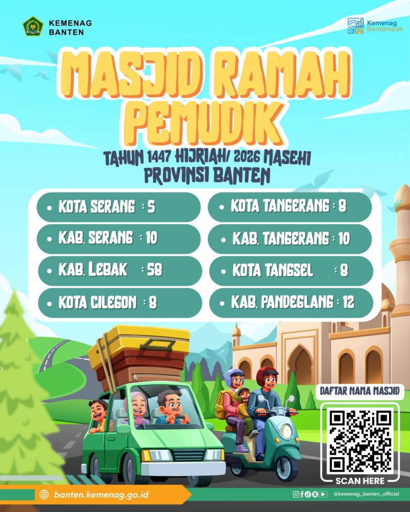 SERANG – Kantor Kewilayahan (Kanwil) Kementerian Agama (Kamenag) Provinsi Banten jalankan program Masjid Ramah Pemudik yang di edarkan Menteri Agama Nomor 1 Tahun 2026. Program ini dirancang untuk memastikan para pemudik Hari Raya Idul Fitri 1447 Hijriah/2026 Masehi mendapatkan layanan keagamaan dan fasilitas umum yang memadai selama perjalanan panjang mereka pulang ke kampung halaman.