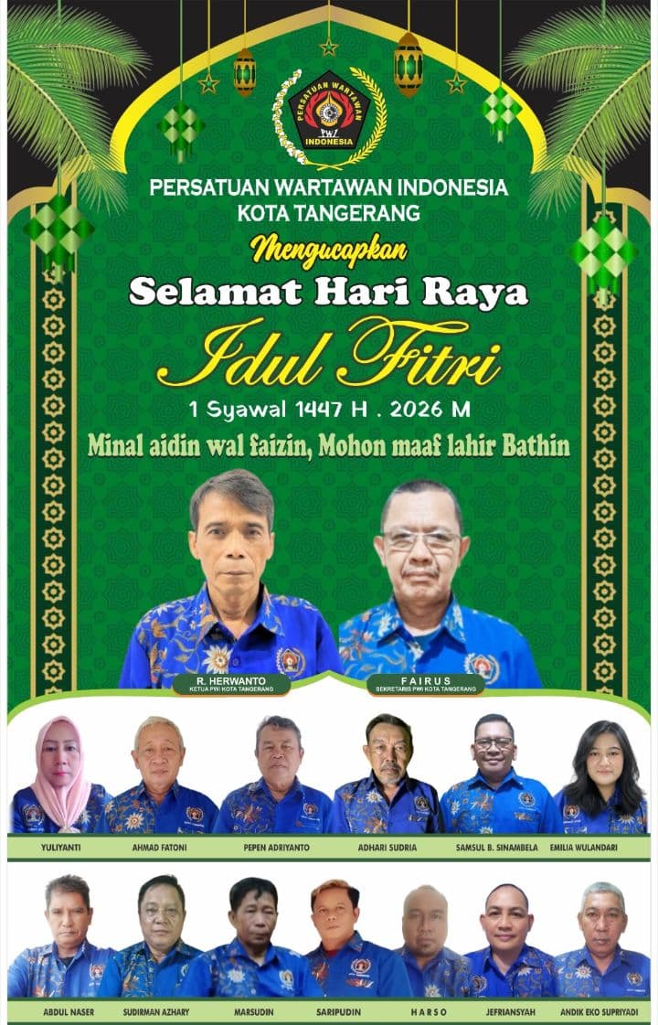 KOTA TANGERANG. – Ketua Persatuan Wartawan Indonesia (PWI) Kota Tangerang Herwanto yang akrab dipanggil Wanto bersama segenap pengurus dan anggota mengucapkan: “Selamat Hari Raya Idul Fitri 1447 H ” Mohon maaf lahir dan bathin”, Semoga kemenangan dan keberkahan selalu menyertai kita semua, Jum’at (20/03/2026).