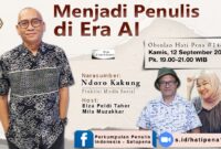 JAKARTA – Perkumpulan Penulis Indonesia SATUPENA akan mendiskusikan menjadi penulis di era kecerdasan buatan atau artificial intelligence (AI) dengan narasumber praktisi media sosial Ndoro…