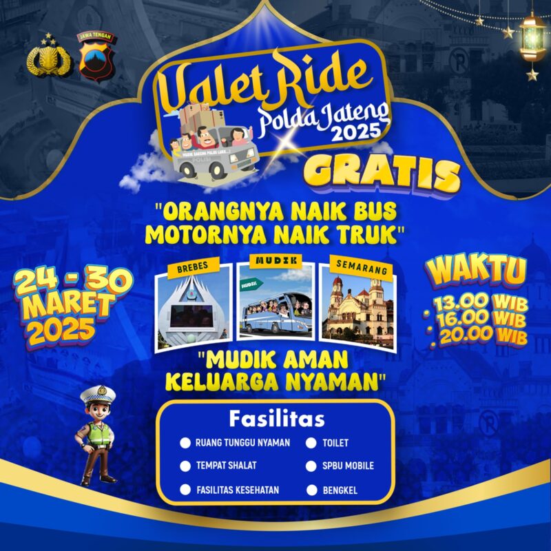 Program Valet Ride hadir sebagai bentuk kepedulian Polda Jateng dalam mendukung mudik aman dan nyaman, sekaligus mengurangi risiko kecelakaan bagi pengguna sepeda motor. Dengan layanan ini, pemudik dapat merasakan perjalanan yang lebih nyaman, aman, dan bebas lelah, sehingga momen pulang ke kampung halaman menjadi lebih menyenangkan.
