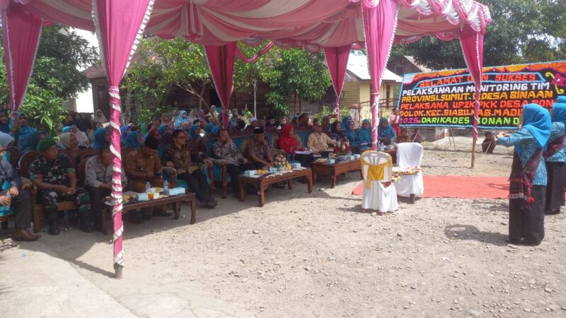 MADINA – Pemerintah Kabupaten Mandailing Natal Propsu bersama TP PKK Kabupaten menyambut hangat kunjungan Tim Monitoring TP PKK Provinsi Sumatera Utara dalam rangka pelaksanaan kegiatan pembinaan di berbagai desa percontohan/ Binaan Kunjungan monitoring tersebut dilaksanakan di beberapa lokasi, UP2K di beberapa Desa kab Madina , seperti di desa Bonandolok kecamatan Siabu Monitoring pada Kamis,28/08/2025 dilaksanakan di halaman Raja Bonandolok ,dan kedatangan Tim Monitoring di sambut masyarakat dengan Gordang Sambilan.
