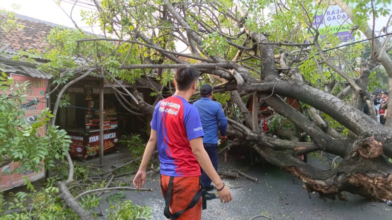 Pohon yang roboh tersebut juga menimpa satu kendaraan roda empat hingga mengalami ringsek pada bagian belakang. Namun, Heriyanto menegaskan tidak ada korban.