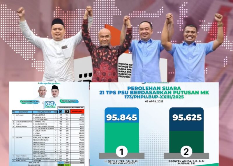 Muarabungo– Calon Bupati Bungo Dedy- Dayat nomor urut 01 berhasil menggempur suara basis rivalnya Jumiwan-Maidani, pada pemungutan suara ulang (PSU) Sabtu (5/4/2025).